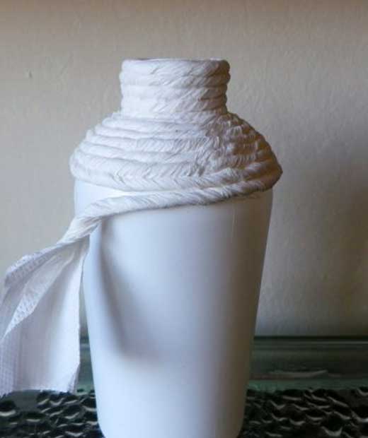 Внутри будущей вазы нужно разместить емкость, в которую потом будет удобно ставить цветы. Это может быть бутылка с узким горлышком, а может быть банка с более широким горлышком. Емкость необходимо обернуть салфеткой и полиэтиленом, чтобы ее можно было легко снять с гипса мотором.